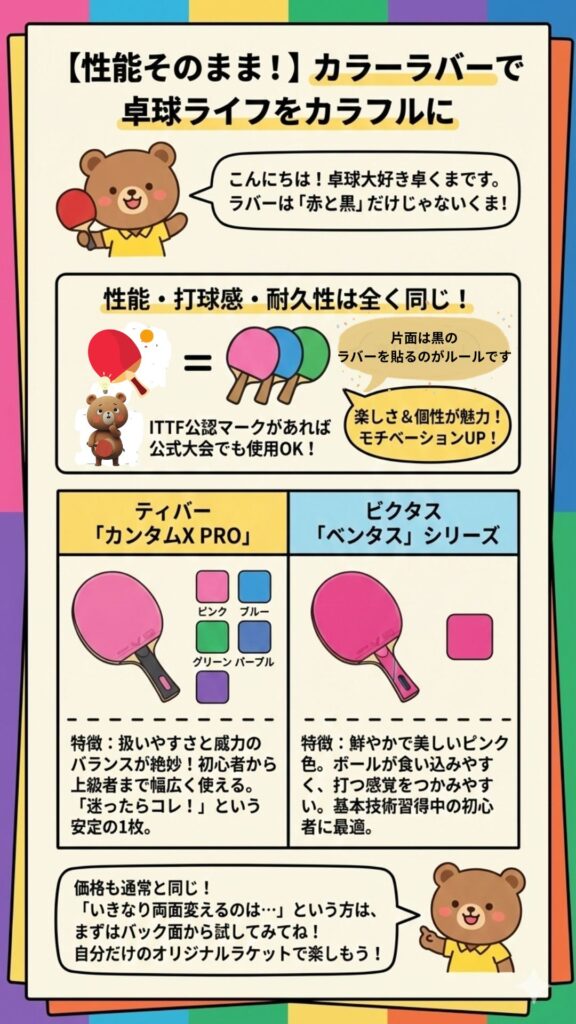 カラーラバーは、性能はそのままに、卓球をより自分らしく楽しむための素晴らしいアイテムです。