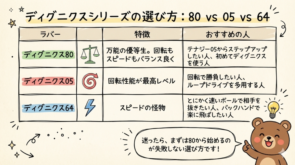 ディグニクス80は、シリーズの中でも突出して「扱いやすさ」と「回転のかけやすさ」のバランスが取れたラバーです。
