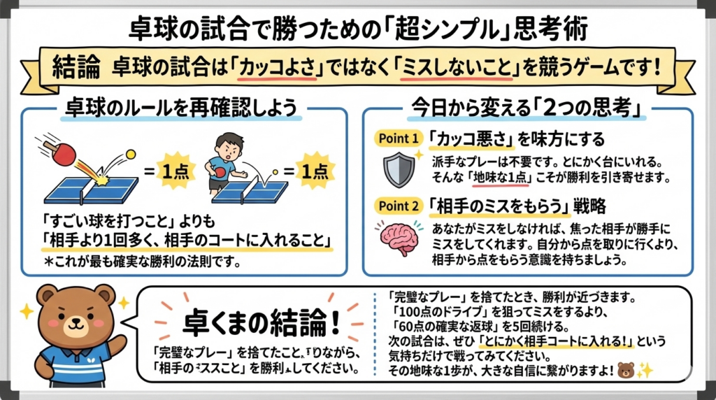 私たちは、いつの間にかこの「最も簡単な勝利の法則」を見失い、「ミスしないこと」よりも「すごいボールを打つこと」を優先してしまっているのではないでしょうか?