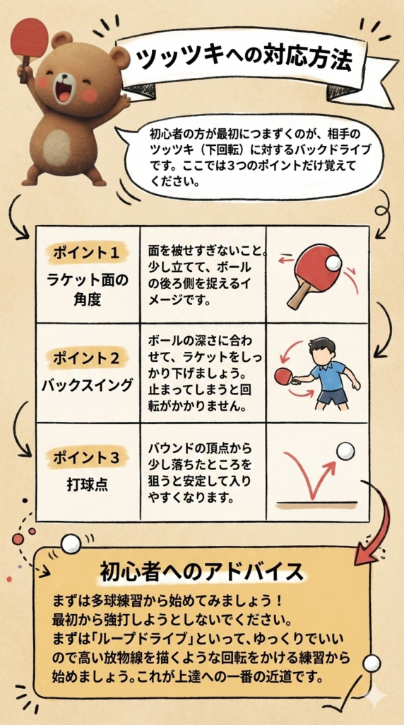 先ほど確認した「力が入る位置」で打てなくなり、バックドライブは安定しません。