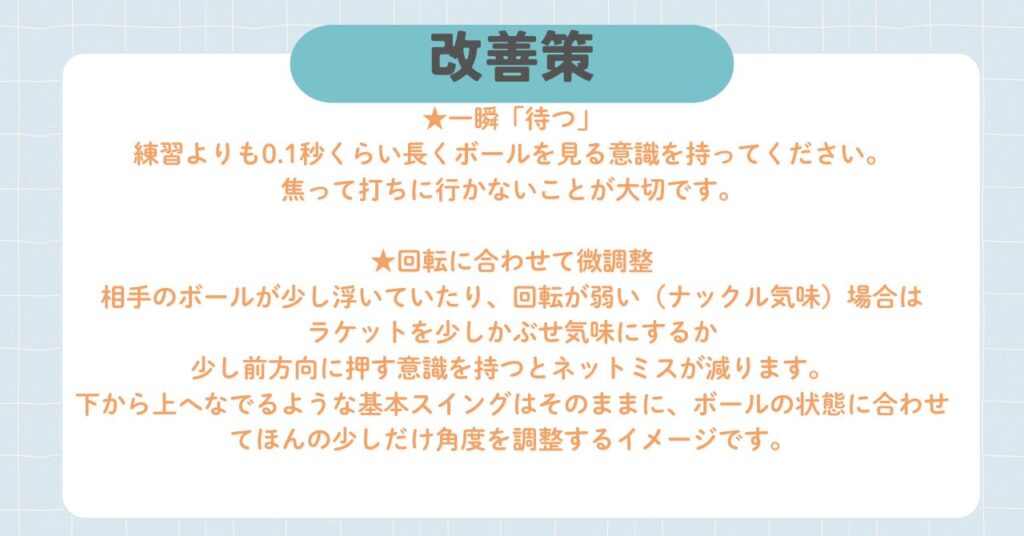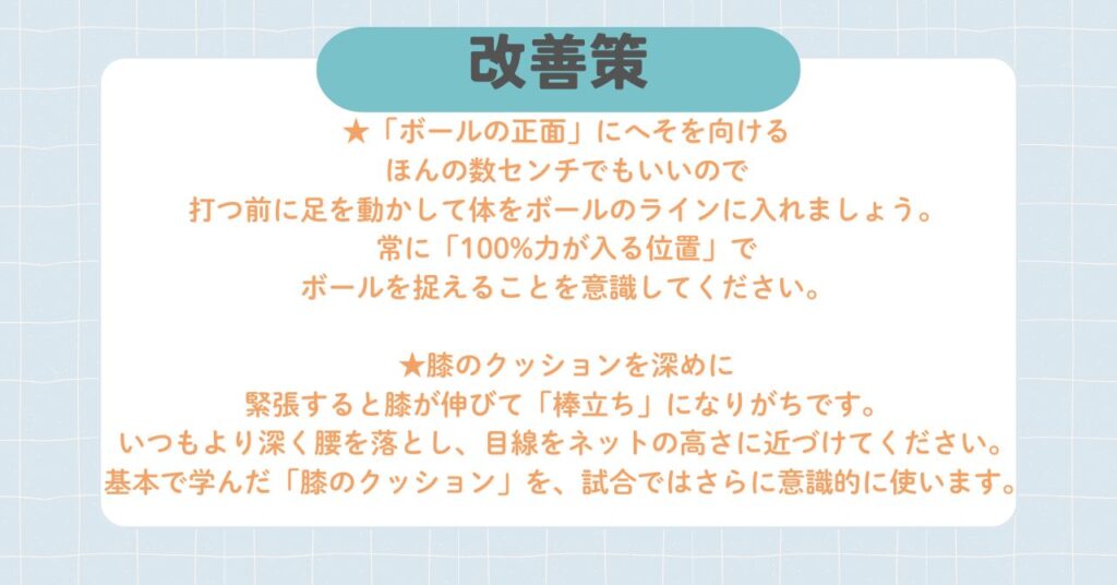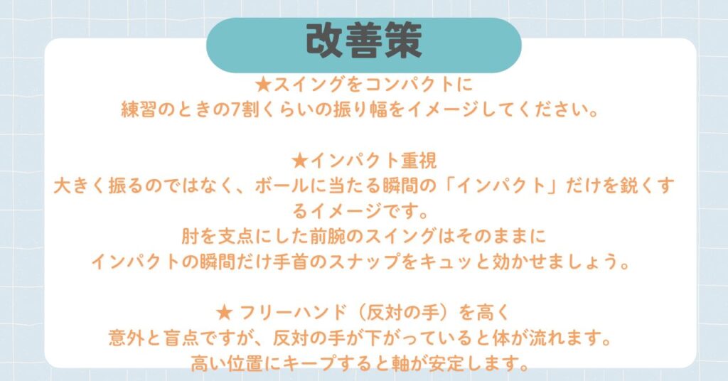 試合で起こる3つの問題(手打ち・大振り・回転判断)に対応していきましょう。