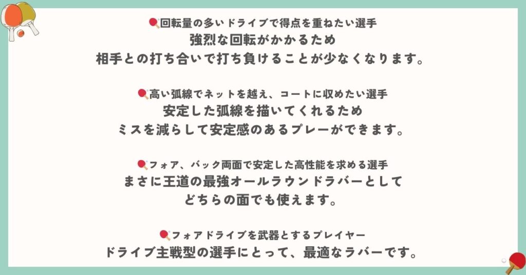回転をかけつつもスピードが出るため、速いドライブやカウンターで得点したい選手に適しています。