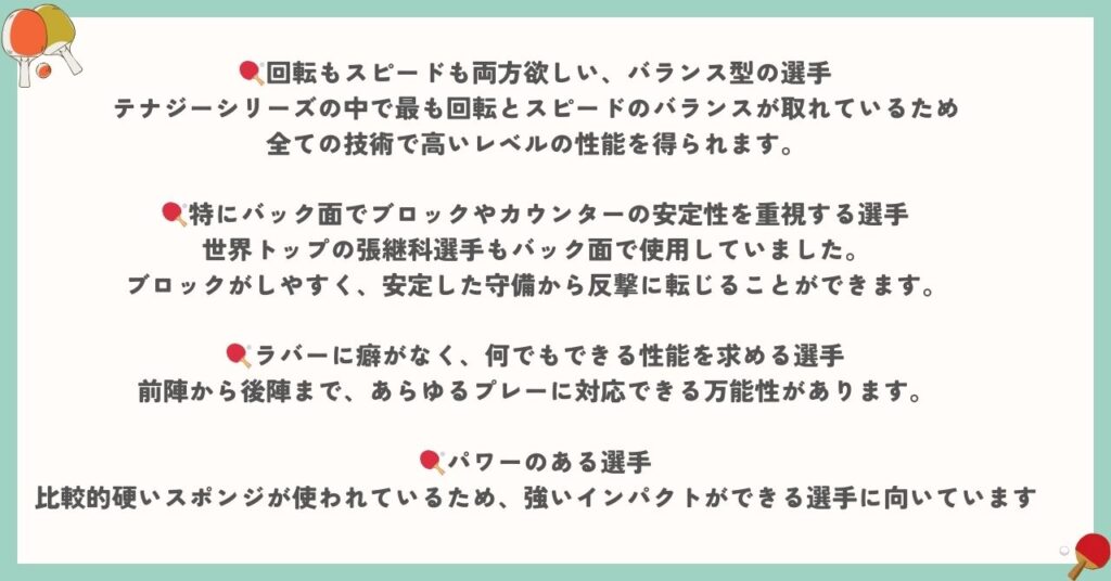 そのため、テナジーシリーズの使用は、卓球の基本的な技術を一通り習得してからのほうがよいかもしれません。
