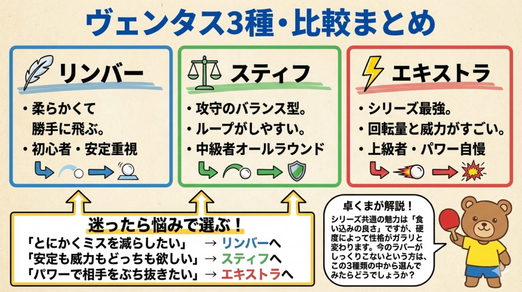 そこで今回は、VICTAS社の「ヴェンタス(VENTUS)」シリーズ3種類を比較し