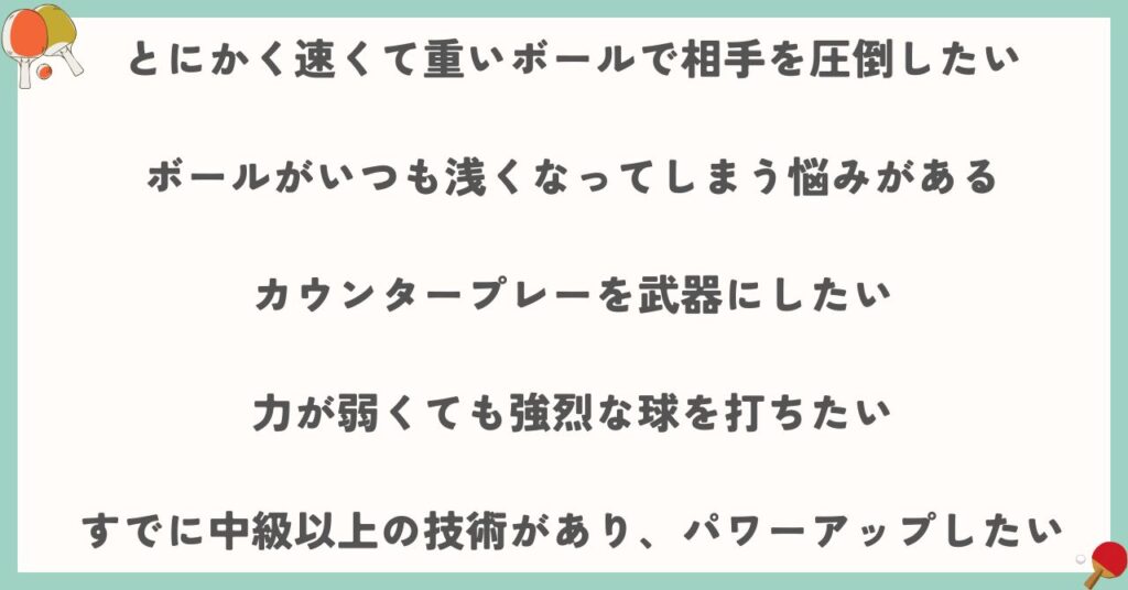 台の近くでプレーする前陣速攻型の選手に最適です。